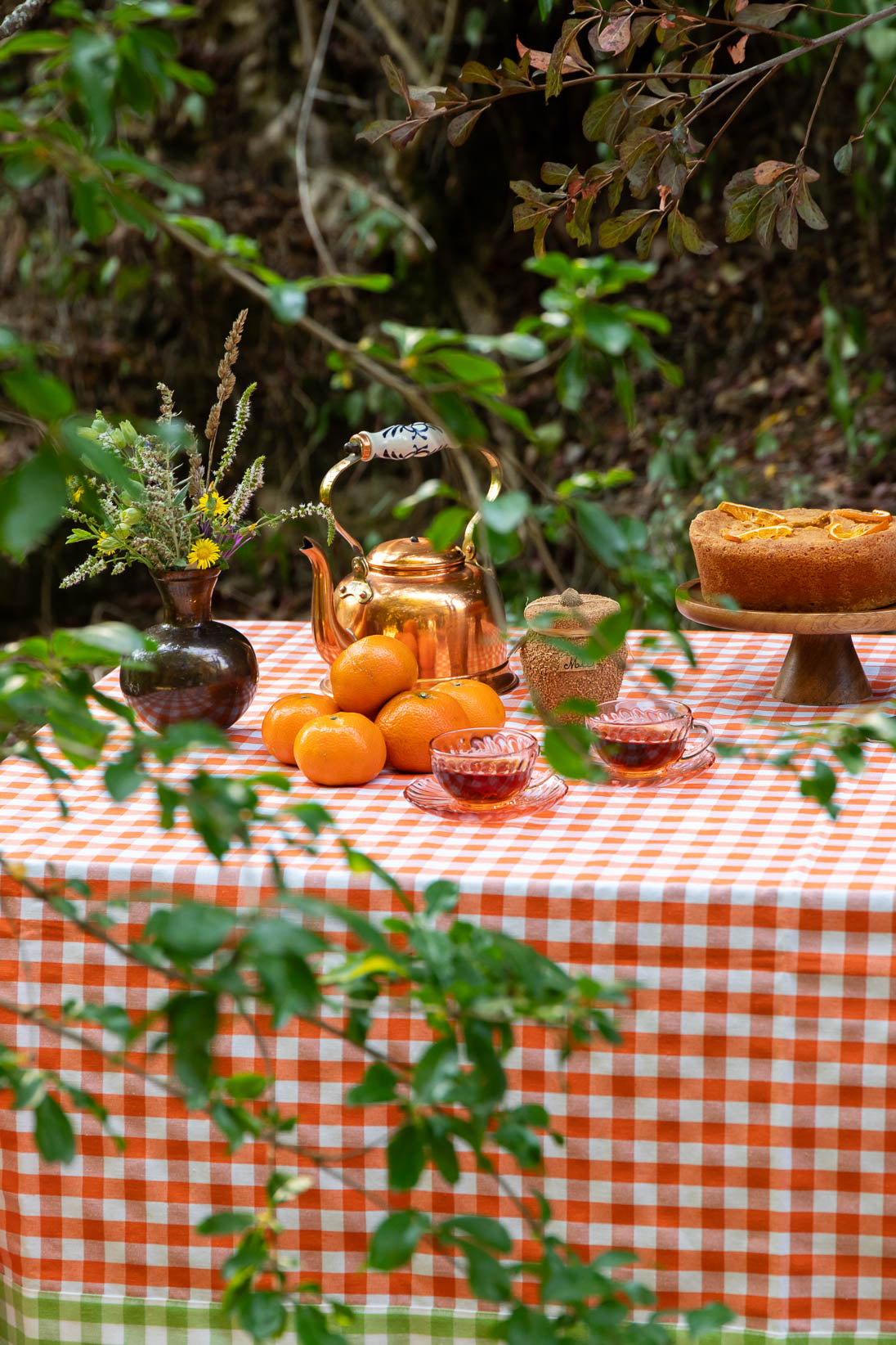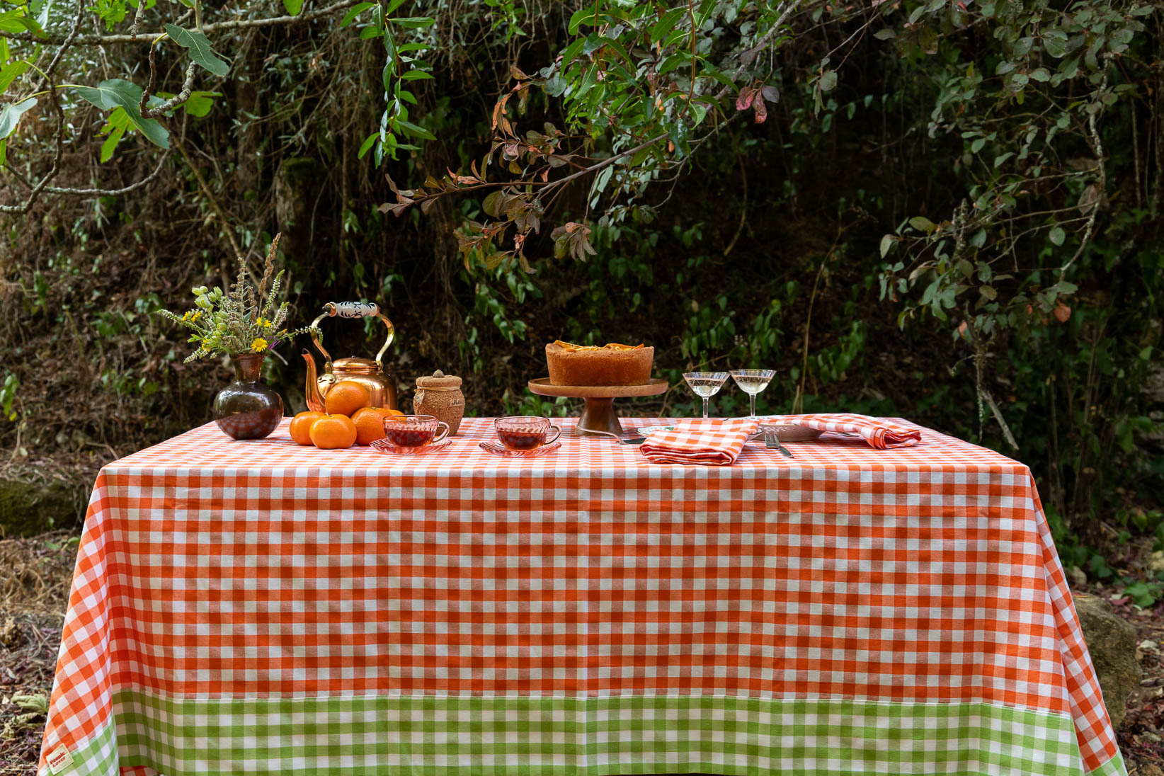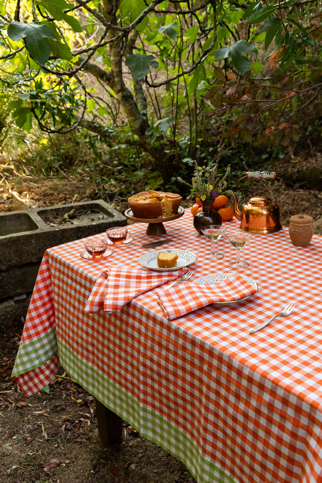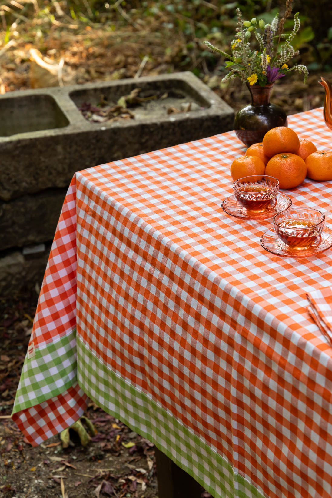 Orange and white vichy tablecloth for the freshest of tablescapes.