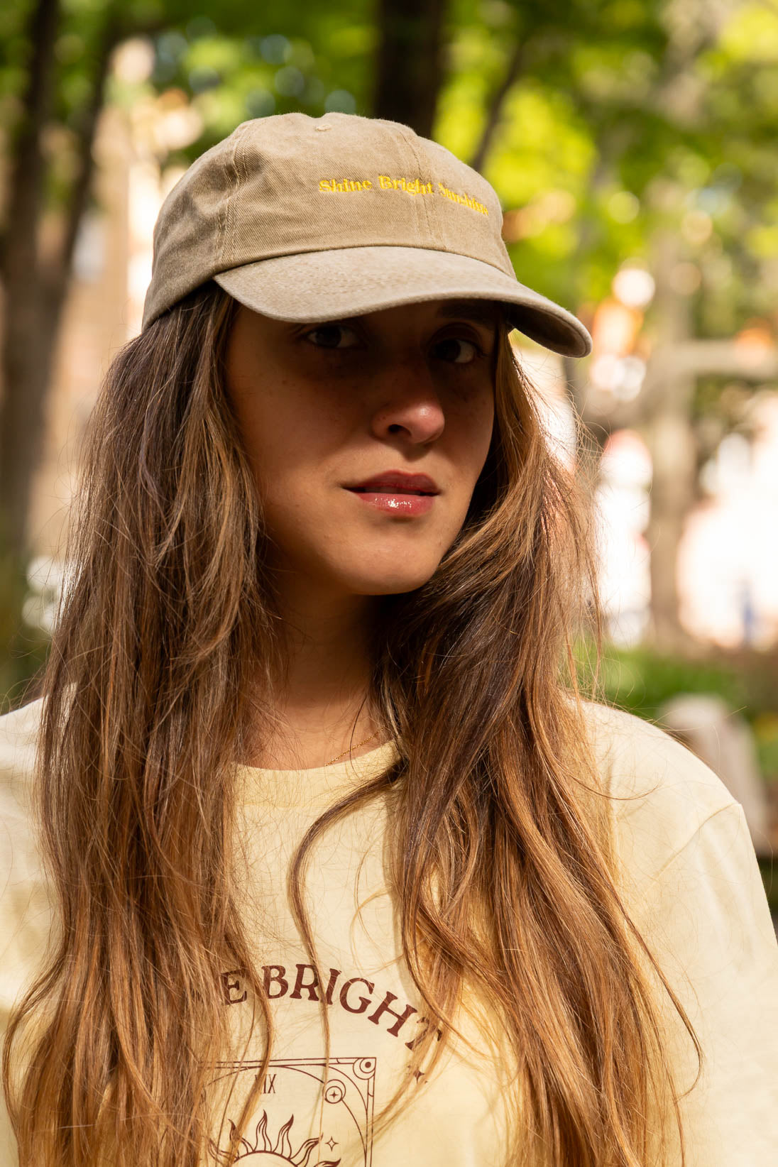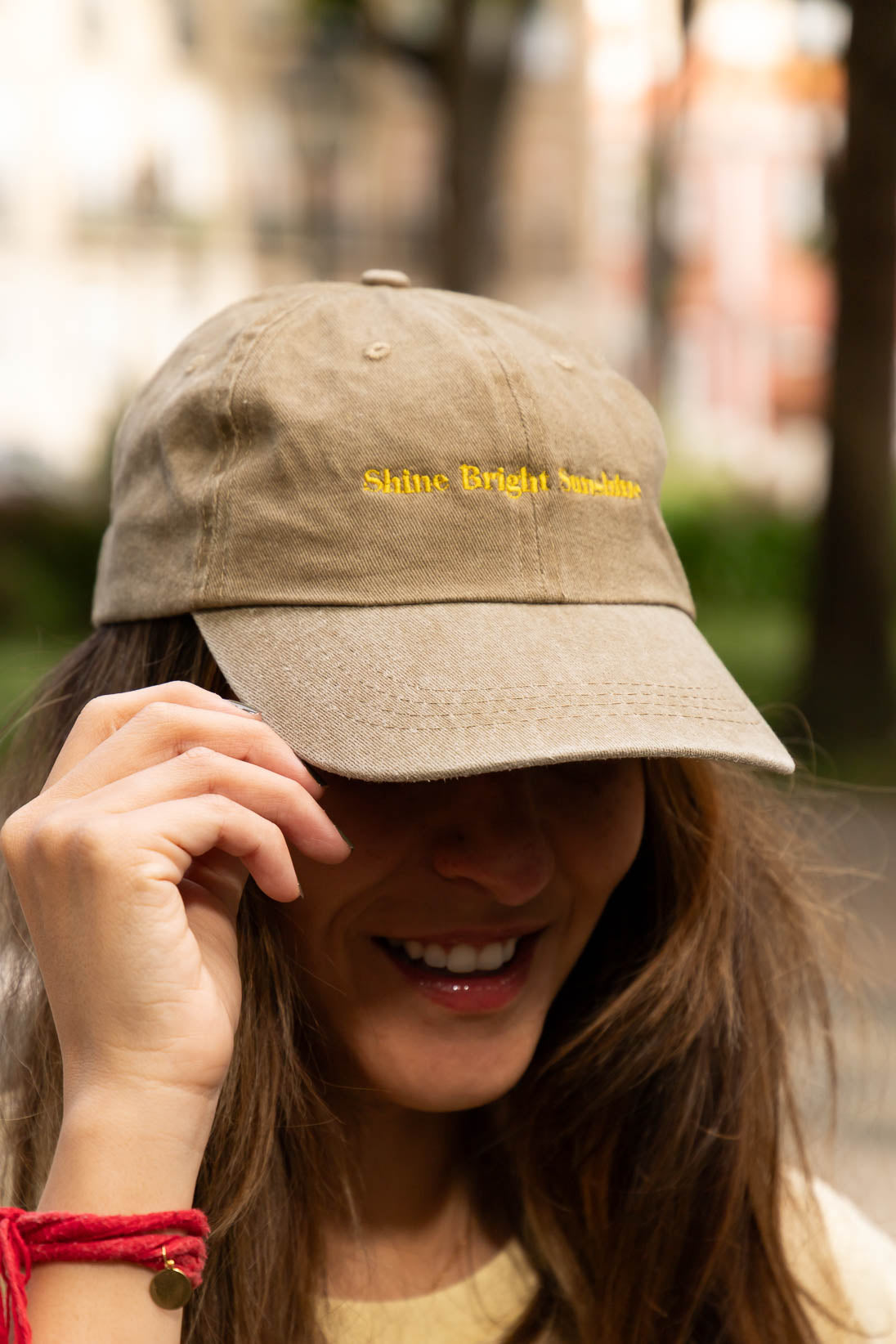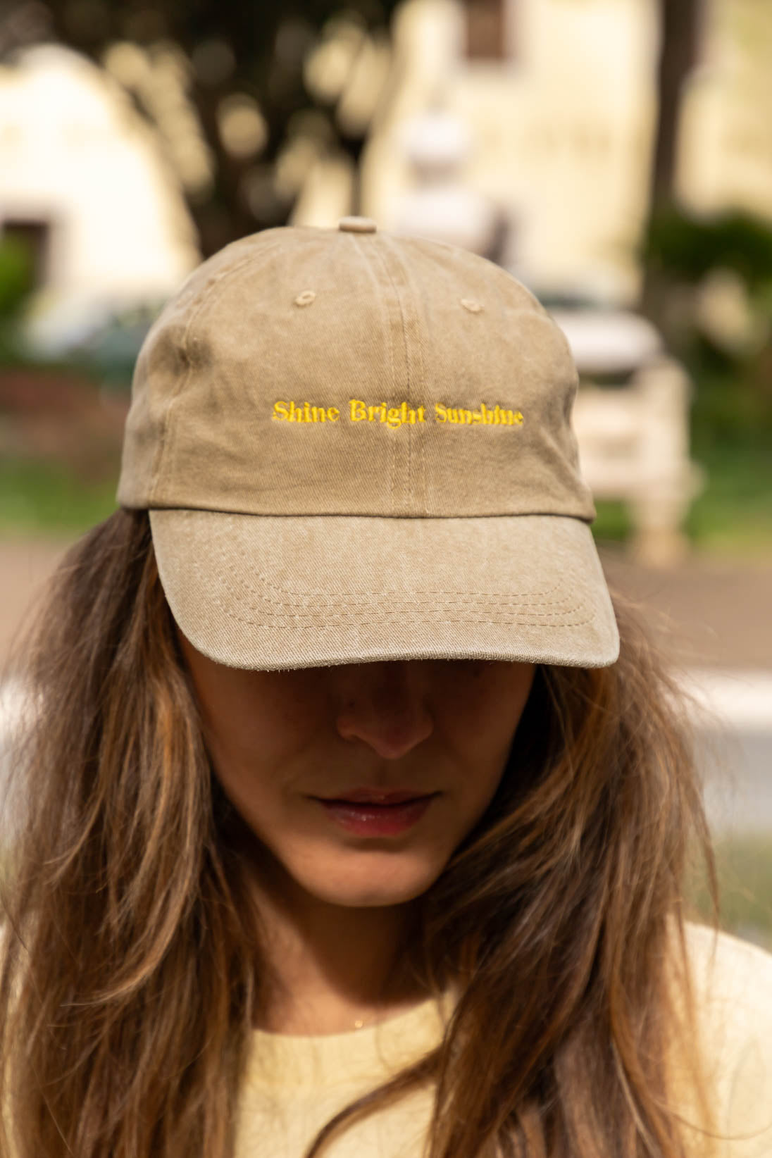 Shine Bright Sunshine Cap – Washed Sand & Yellow Embroidery