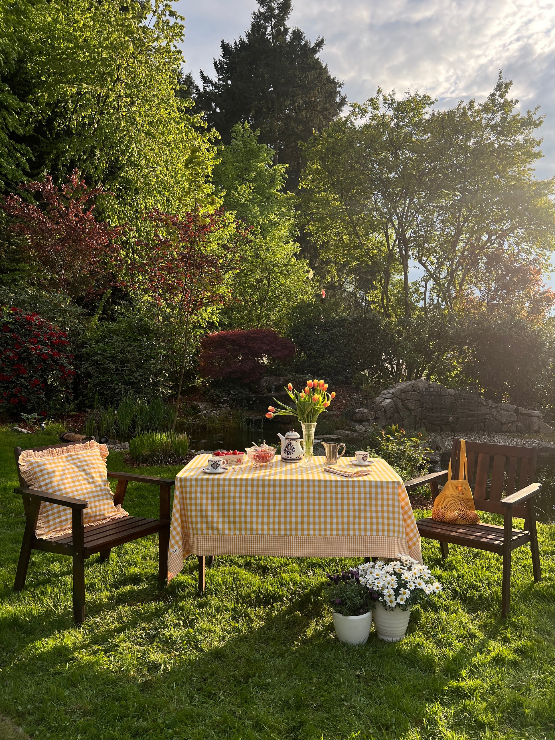 Bring sunshine to your table with our Yellow Vichy Tablecloth, featuring a cheerful yellow gingham pattern and finished with delicate mini vichy checks along the edges. It's your go-to piece for spring brunches, summer dinners, and spontaneous picnics under the sun.